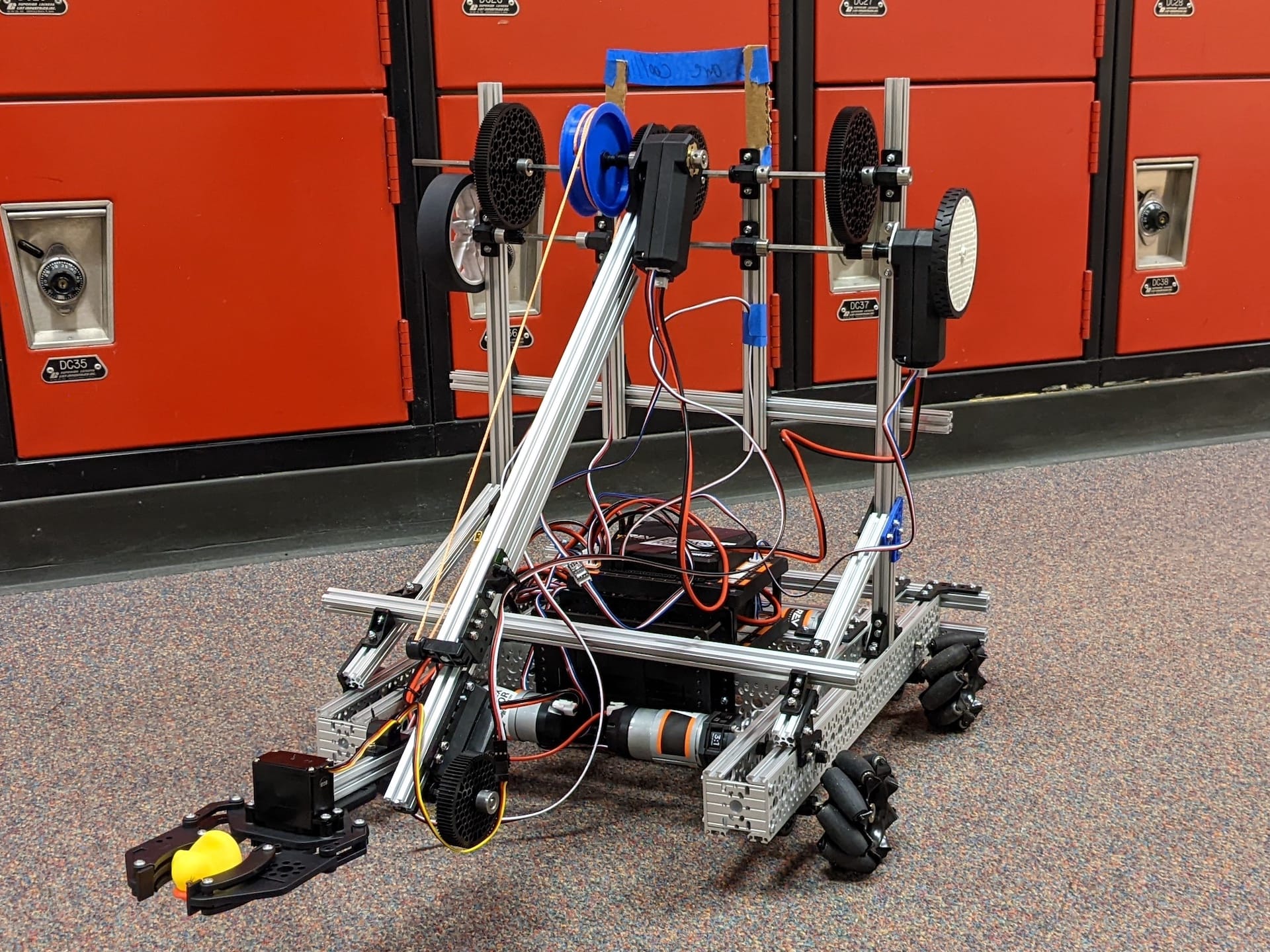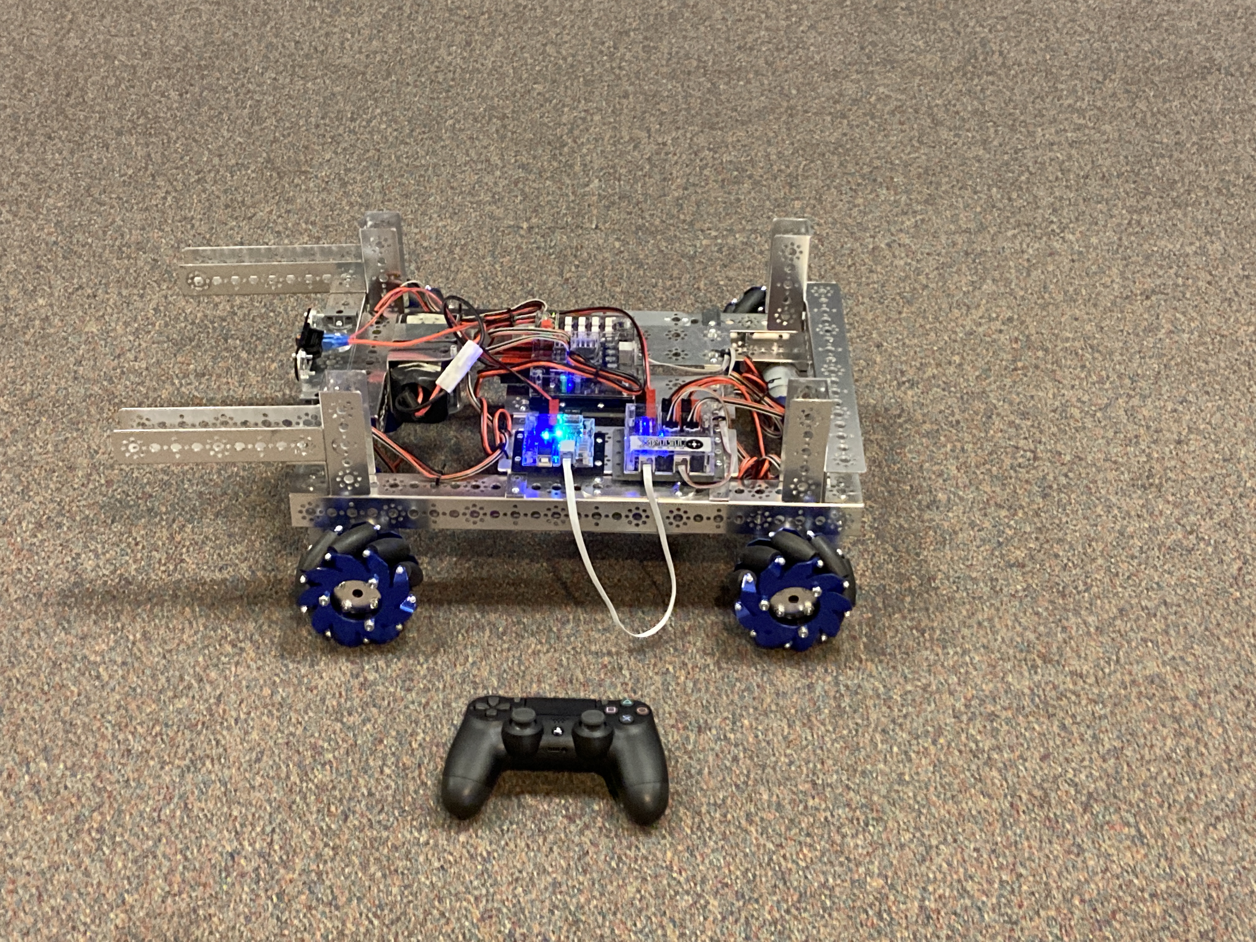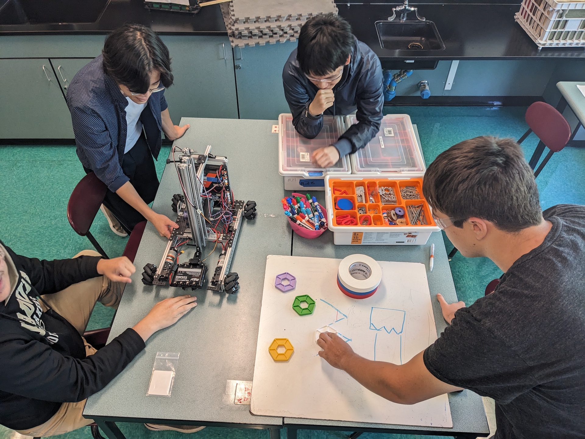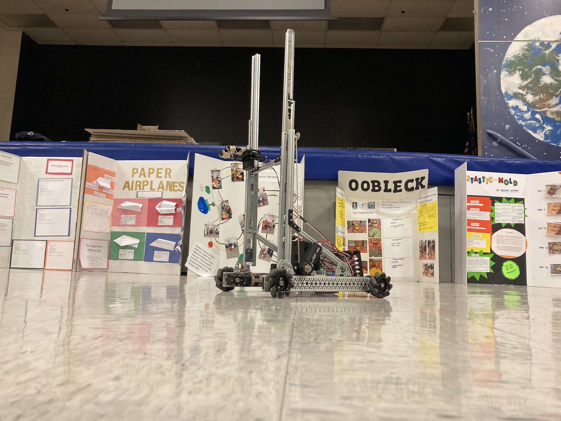 We decided to approach our second season with the same creativity that won us an Innovate Award the previous year. The challenge this year was to place pixels (hexagons) on an inclined board to create “mosaics.” There were also opportunities to launch paper airplanes (“drones”) and hang the robot. While we managed to increase our outreach to our local STEM community a lot, winning us the Motivate Award, we suffered several setbacks in our design, which led to us once again ranking near the bottom of our qualifying tournament.